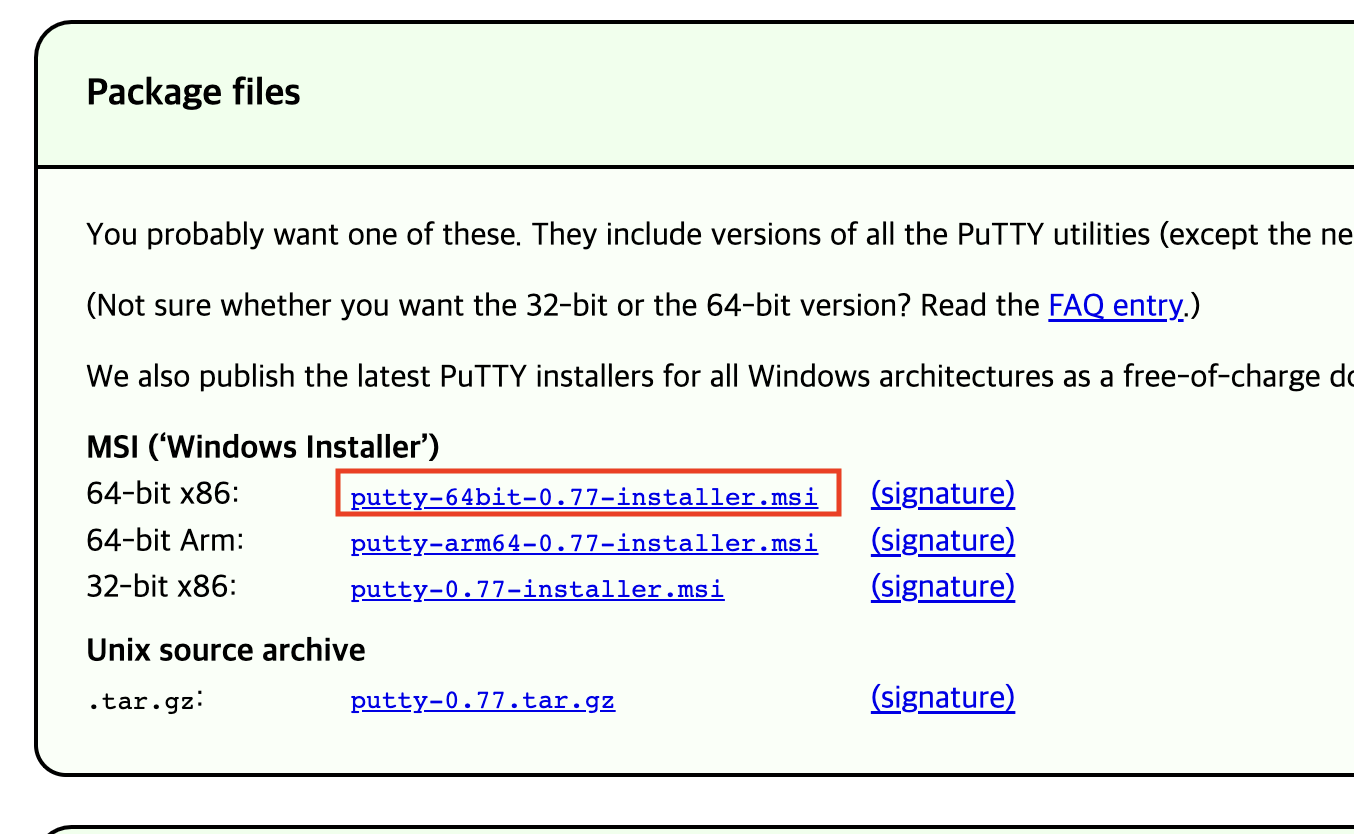 라즈베리 파이 원격 접속 세팅은 쉽지 않은 길이다... 윈도우의 경우 putty를 이용하여 접속하는 것이 일반적이다. 다운로드 받을 수 있는 사이트 링크는 이곳이다. 들어가보면 알 수 있듯 뭐가 엄청 많이 있다 👀 본인의 환경에 맞는 것을 선택하면 되는데 대부분은 아마 이거일 것이다.