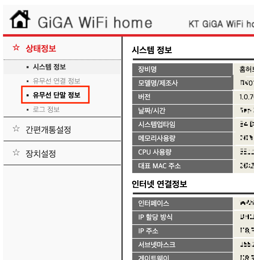 그리고 좌측의 유무선 단말 정보를 클릭하면