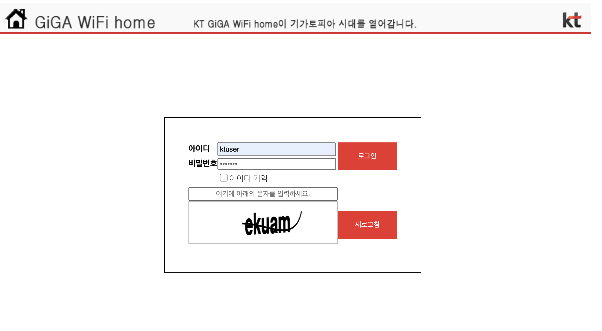 GiGa WiFi home이라는 페이지가 나온다. 초기 아이디와 비밀번호는 ktuser와 homehub 이다. 로그인을 해주자.