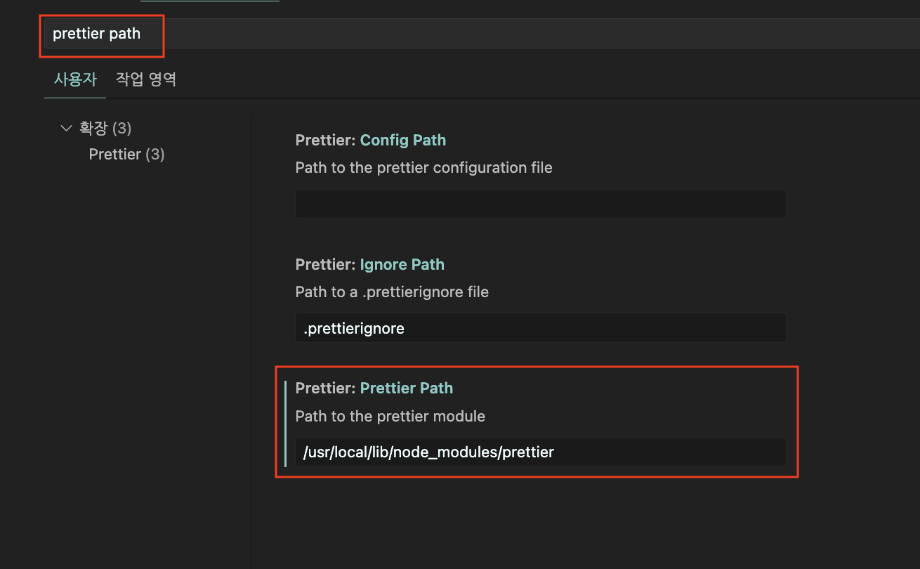 그리고 위 사진과 같이 prettier path를 설정해보자. OS별로 path는 다음과 같다.